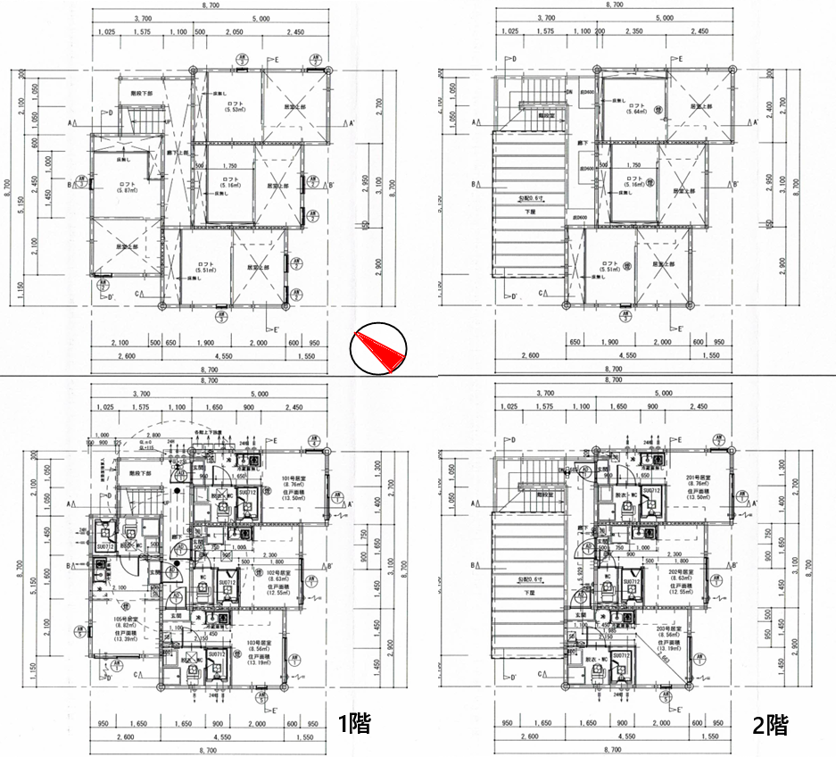 用途地域は第一種低層住居専用地域、建蔽率50%・容積率100%。北西側約3.8m公道に約2.1m接道しており、接道条件により将来の建替えについては制限があります。そのため、本物件は「再建築を前提としない、既存建物からの収益確保」を重視した投資に適した内容です。